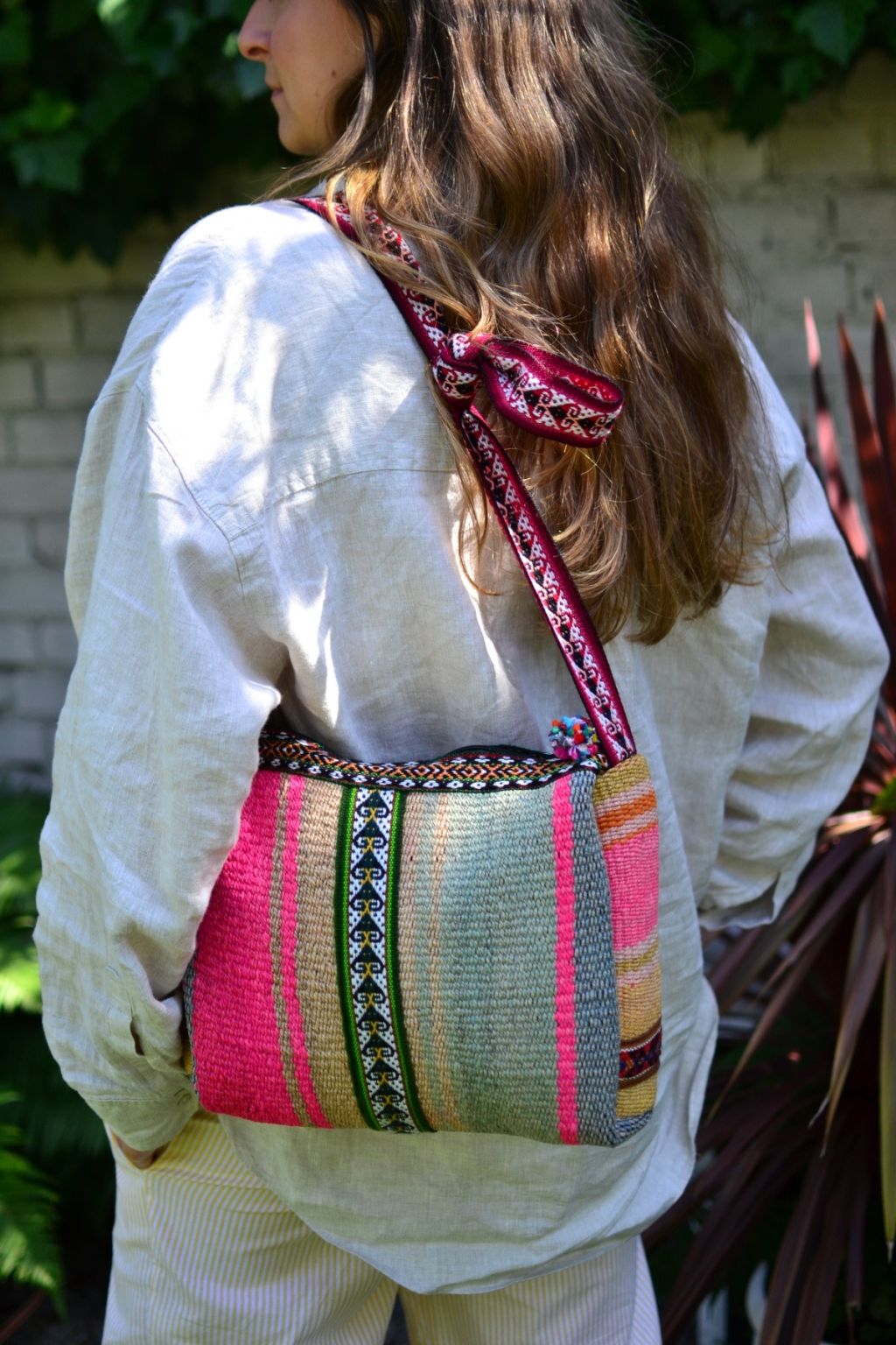 Pasek torebki jest wełniany i na tyle długi, że można samemu regulować jego długość supełkiem zgodnie z indywidualnymi preferencjami.