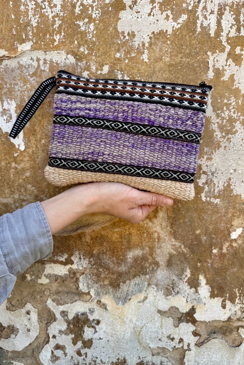 Saszetka w rozmiarze L na zamek uszyta w Peru z ręcznie tkanej i naturalnie barwionej wełny. W środku wykończona czarną podszewką.