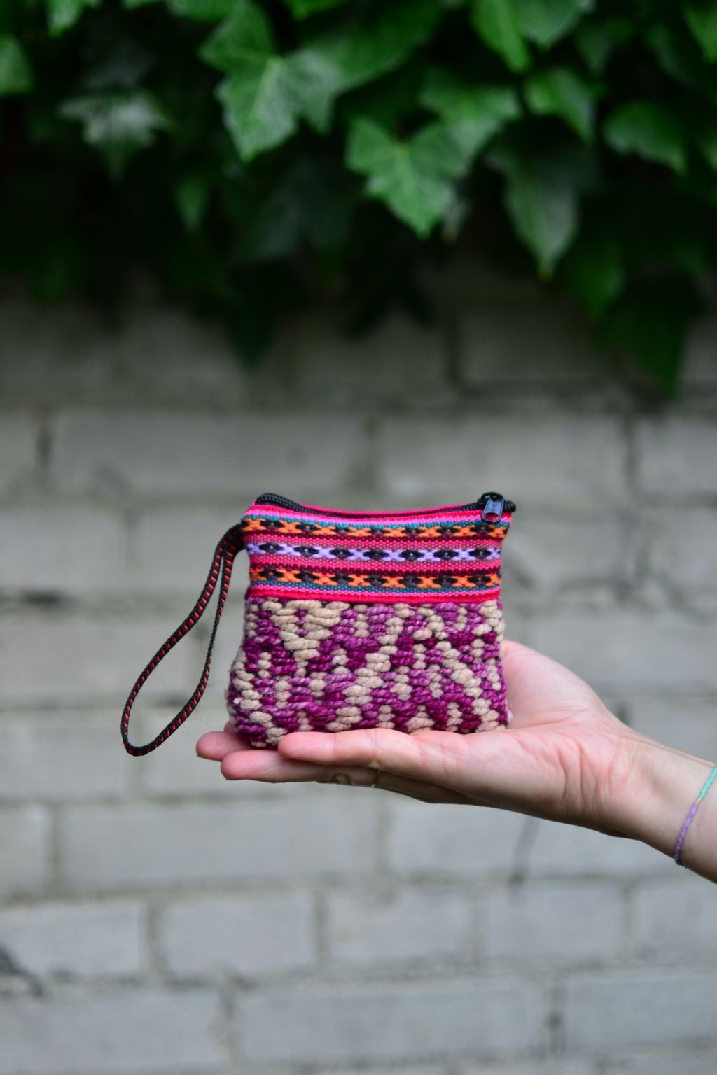 Saszetka w rozmiarze XS na zamek uszyta w Peru z ręcznie tkanej i naturalnie barwionej wełny. W środku wykończona czarną podszewką.