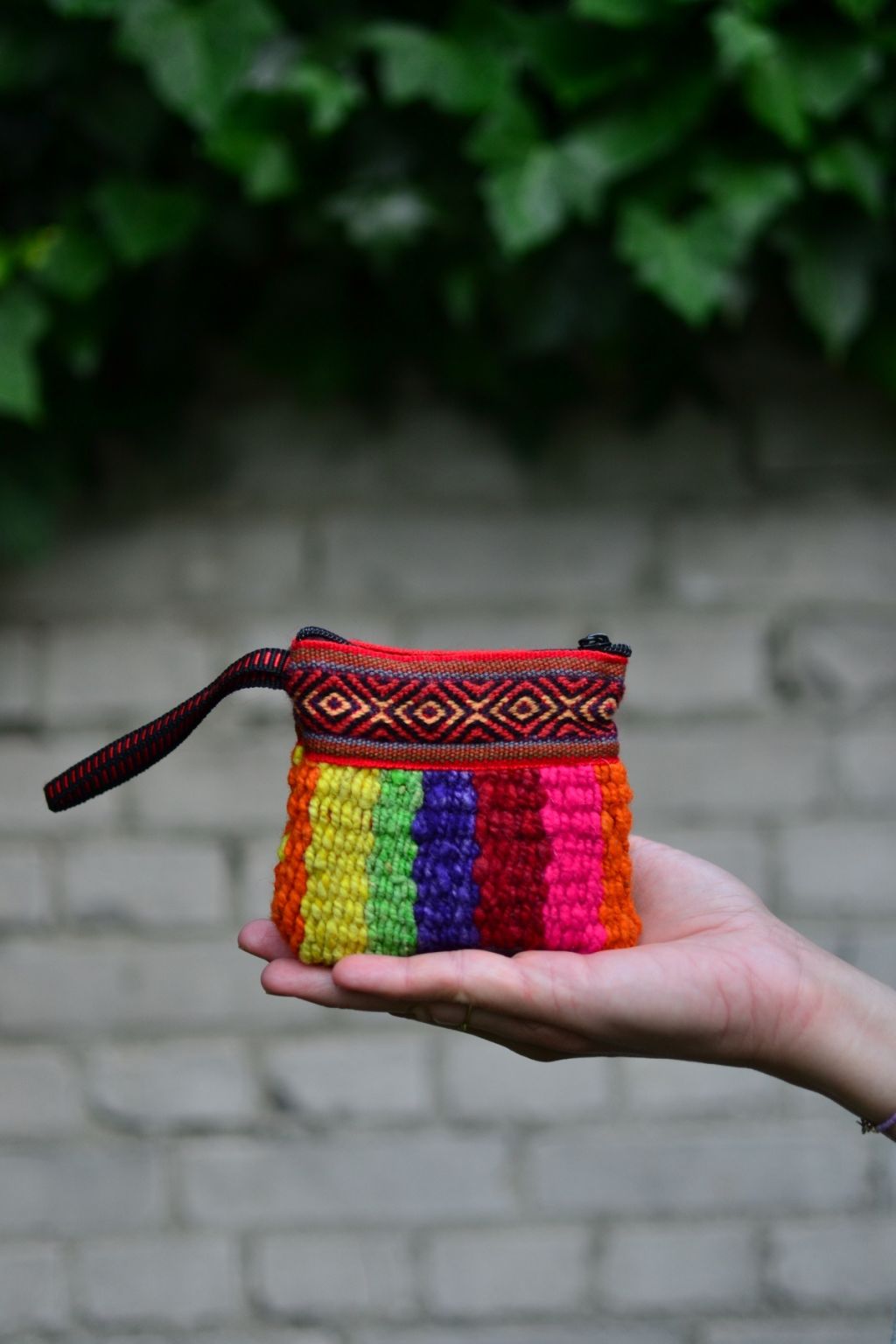 Saszetka w rozmiarze XS na zamek uszyta w Peru z ręcznie tkanej i naturalnie barwionej wełny. W środku wykończona czarną podszewką.
