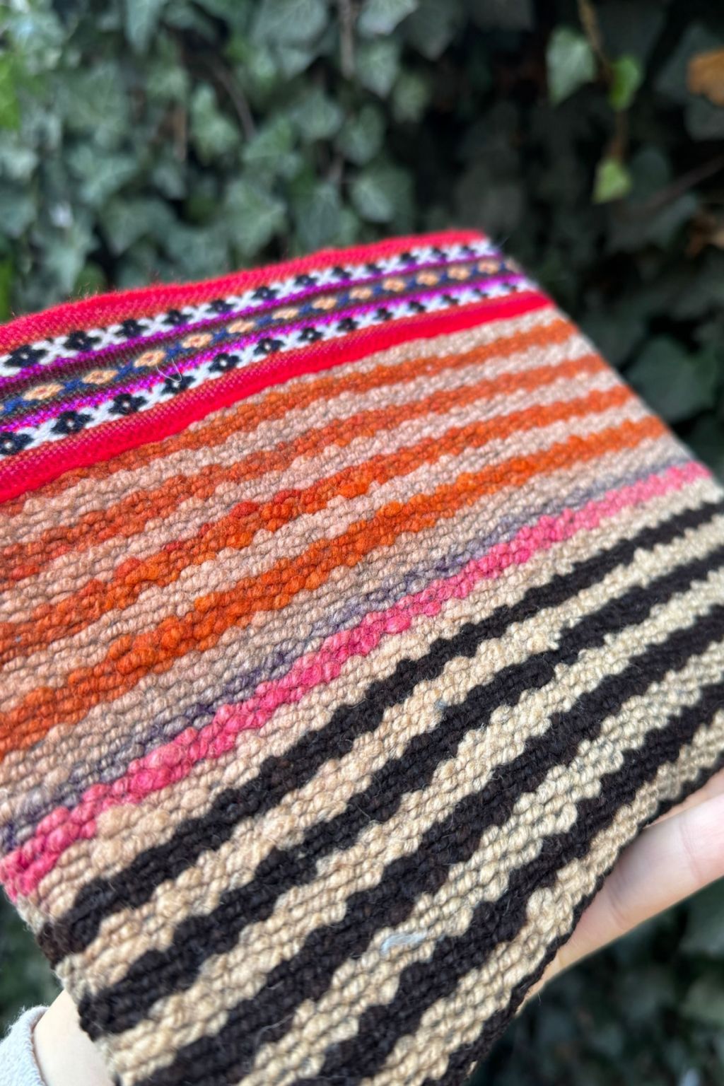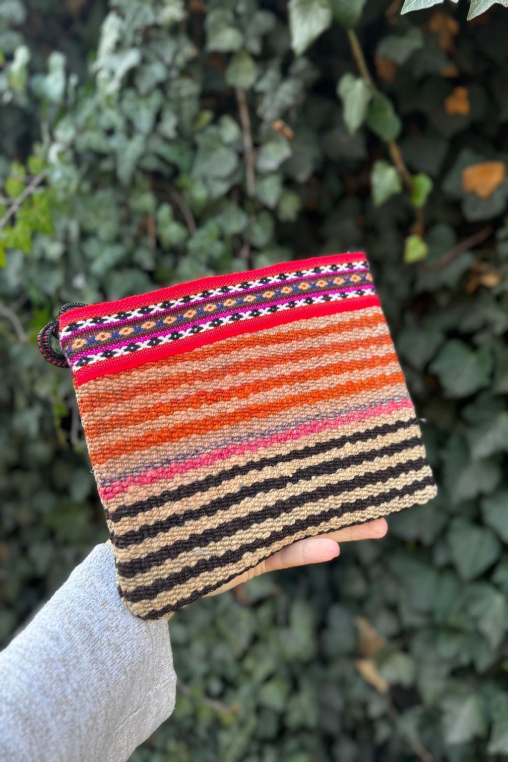 Saszetka w rozmiarze L na zamek uszyta w Peru z ręcznie tkanej i naturalnie barwionej wełny. W środku wykończona czarną podszewką.