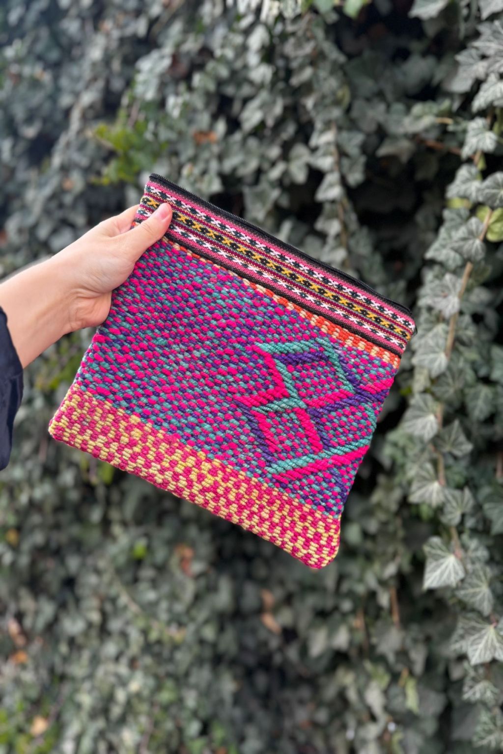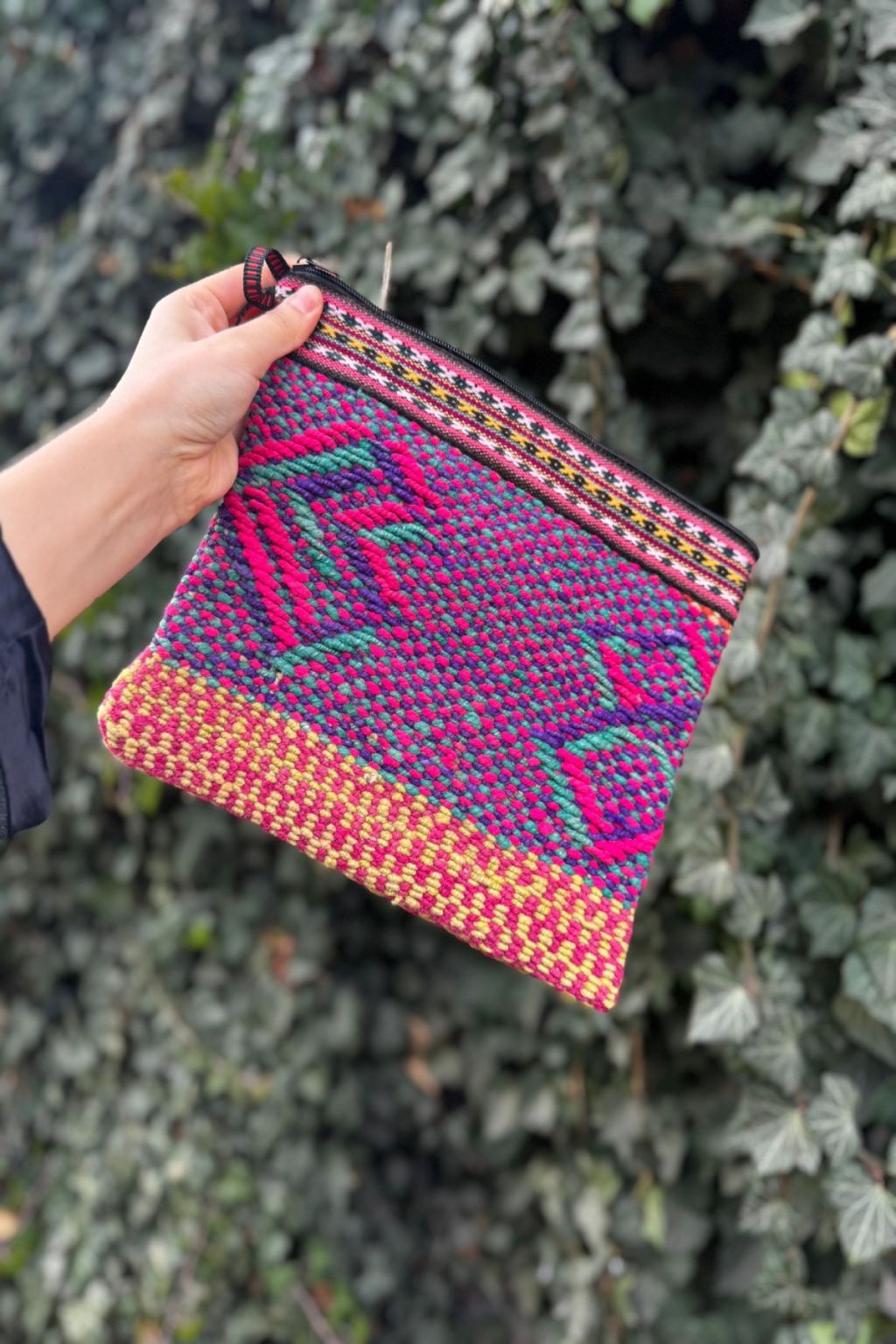 Saszetka dwustronna w rozmiarze XL na zamek uszyta w Peru z ręcznie tkanej i naturalnie barwionej wełny. W środku wykończona czarną podszewką.