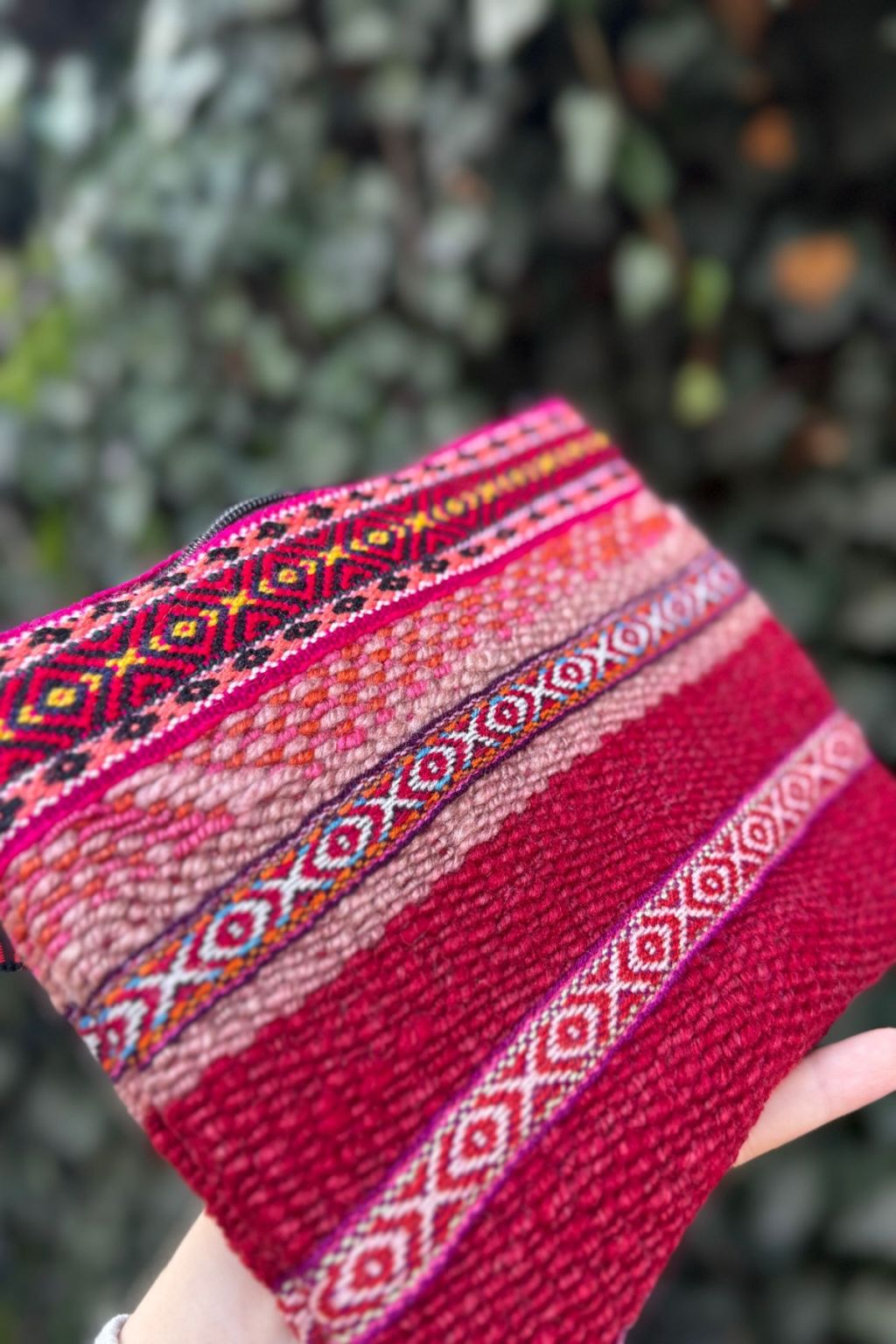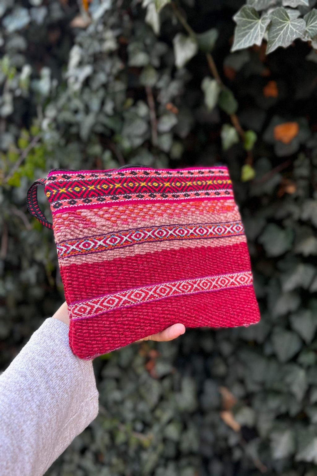 Saszetka w rozmiarze L na zamek uszyta w Peru z ręcznie tkanej i naturalnie barwionej wełny. W środku wykończona czarną podszewką.