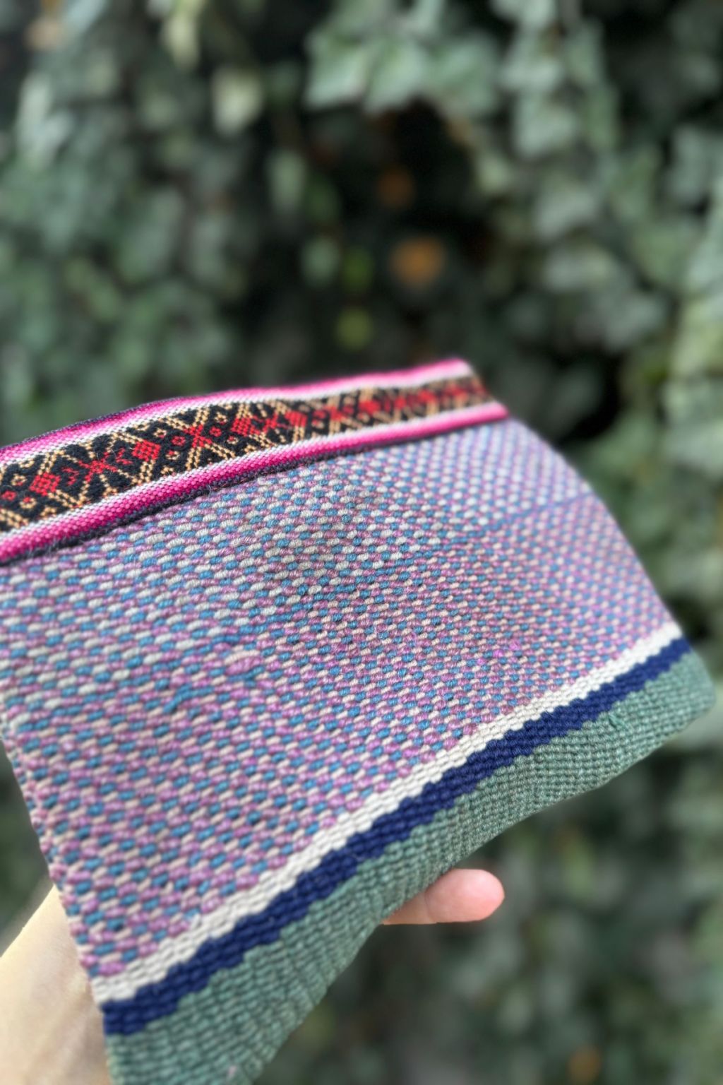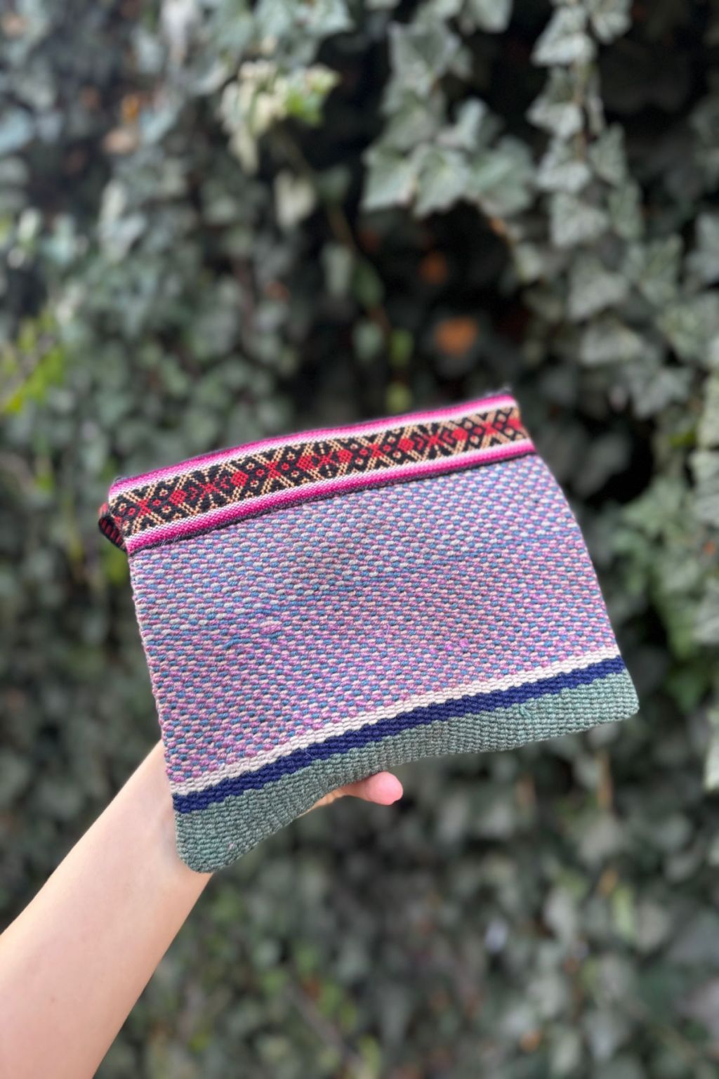 Saszetka w rozmiarze L na zamek uszyta w Peru z ręcznie tkanej i naturalnie barwionej wełny. W środku wykończona czarną podszewką.