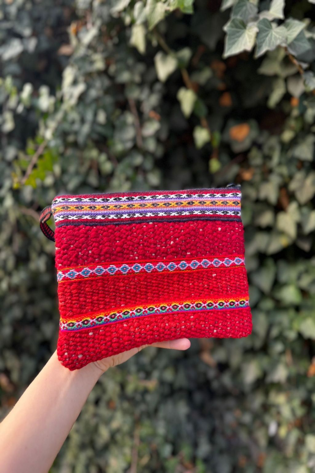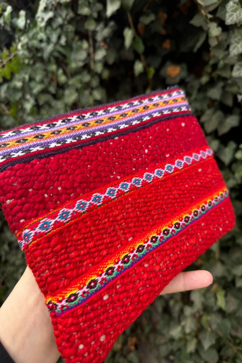 Saszetka w rozmiarze L na zamek uszyta w Peru z ręcznie tkanej i naturalnie barwionej wełny. W środku wykończona czarną podszewką.