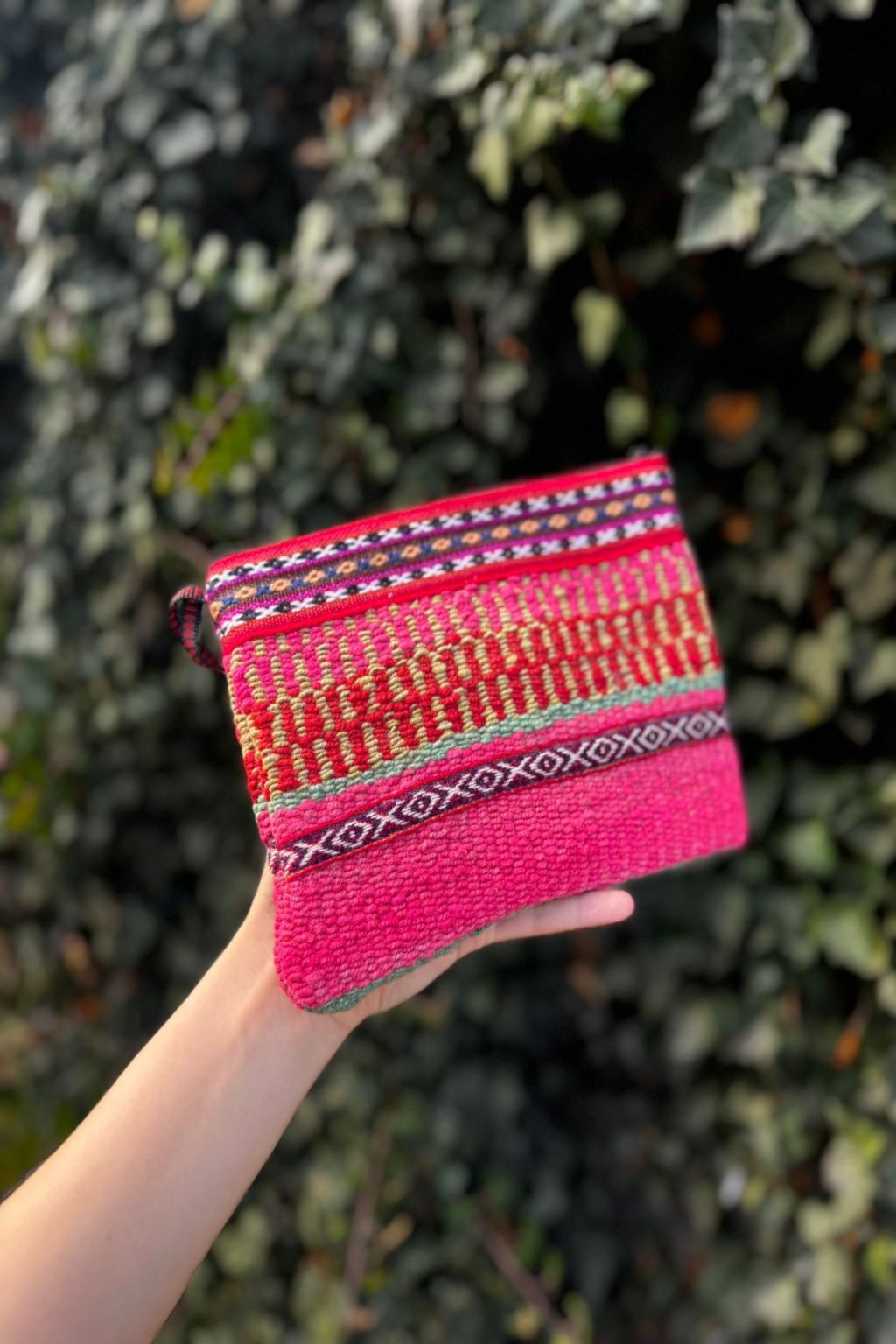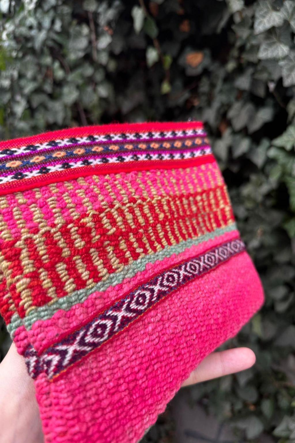 Saszetka w rozmiarze L na zamek uszyta w Peru z ręcznie tkanej i naturalnie barwionej wełny. W środku wykończona czarną podszewką.