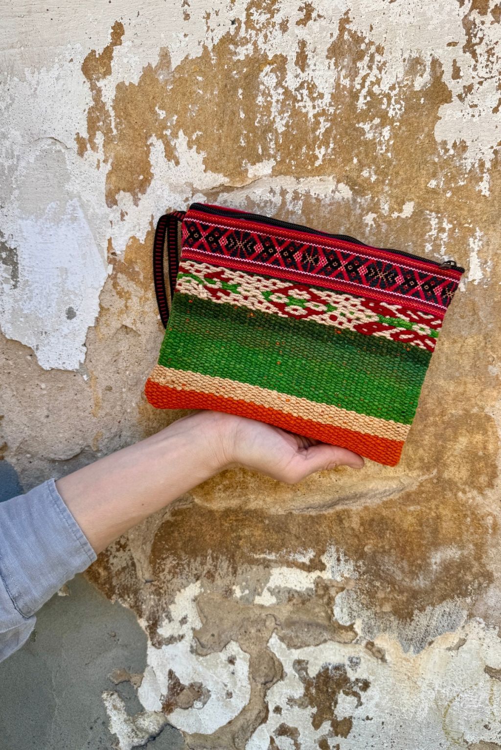 Saszetka w rozmiarze L na zamek uszyta w Peru z ręcznie tkanej i naturalnie barwionej wełny. W środku wykończona czarną podszewką.