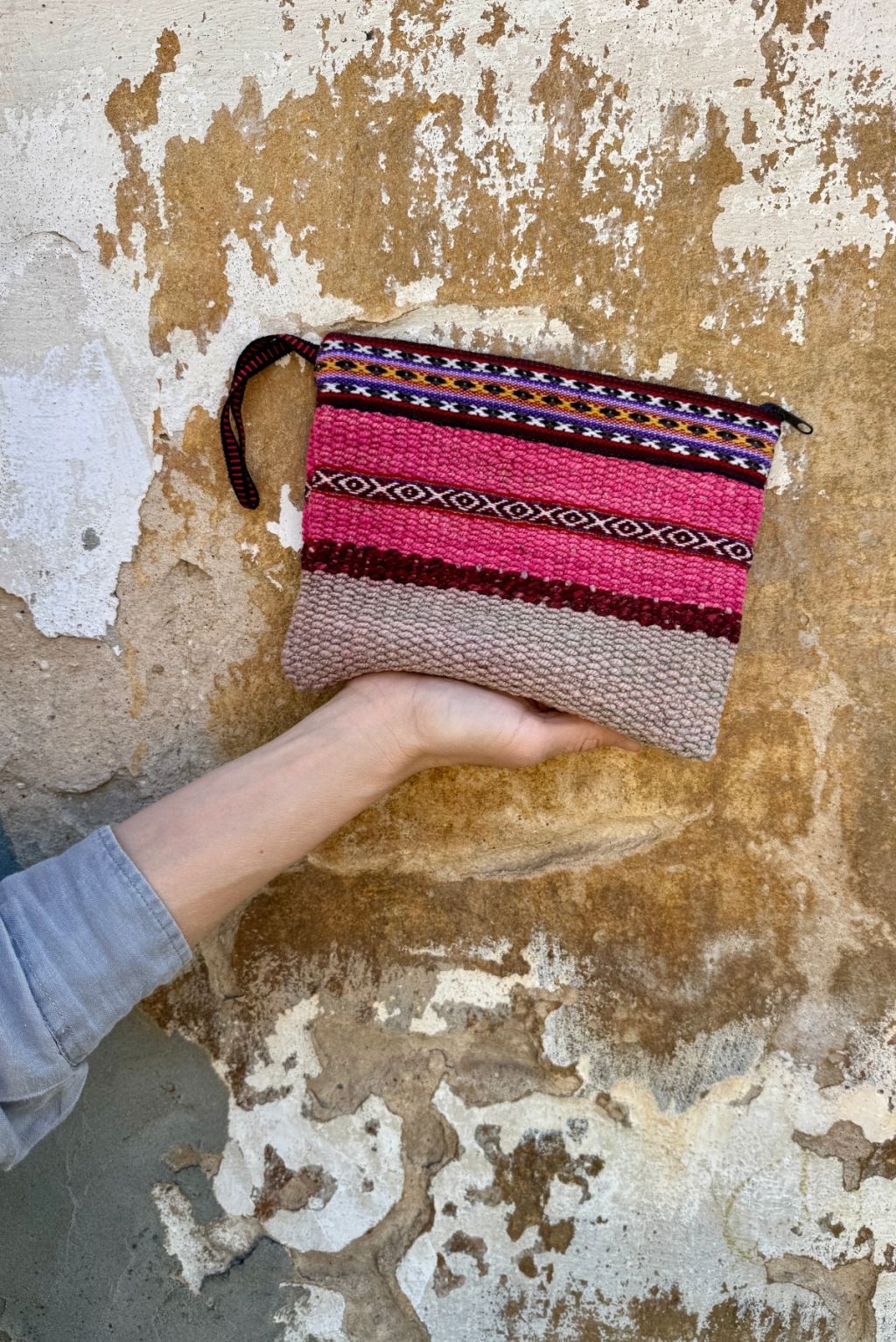 Saszetka w rozmiarze L na zamek uszyta w Peru z ręcznie tkanej i naturalnie barwionej wełny. W środku wykończona czarną podszewką.