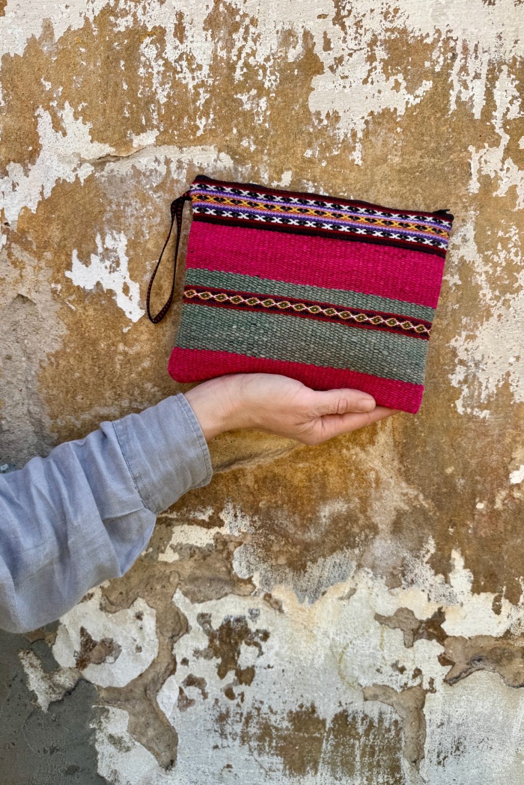 Saszetka w rozmiarze L na zamek uszyta w Peru z ręcznie tkanej i naturalnie barwionej wełny. W środku wykończona czarną podszewką.