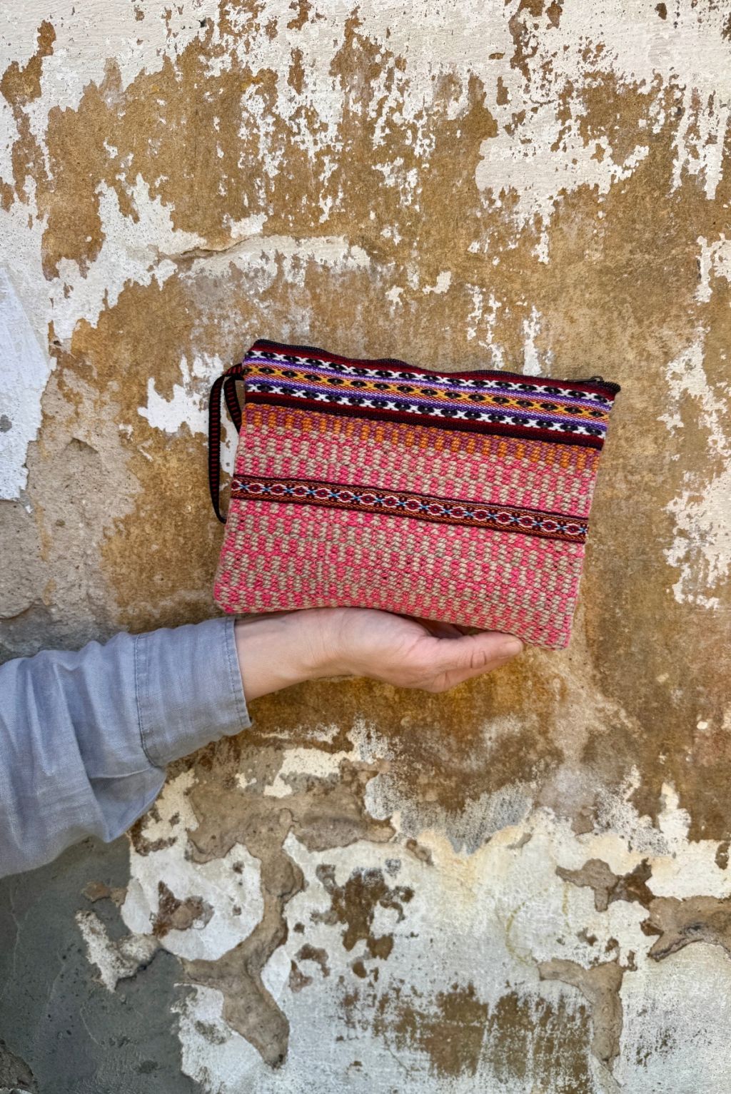 Saszetka w rozmiarze L na zamek uszyta w Peru z ręcznie tkanej i naturalnie barwionej wełny. W środku wykończona czarną podszewką.