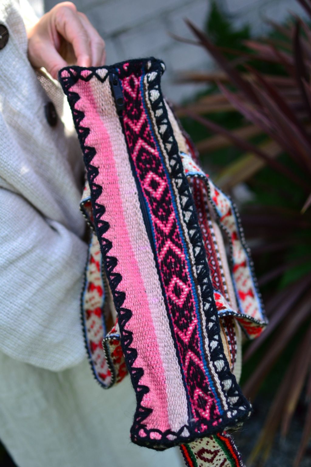 Duża torba shopper uszyta w Peru z ręcznie tkanej i naturalnie barwionej wełny. W środku wykończona czarną podszewką. Zapisana na zamek. Posiada jedną komorę i małą kieszonkę na zamek. Torba jest bardzo pojemna. Posiada dwa uchwyty i dodatkowy długi pasek.
