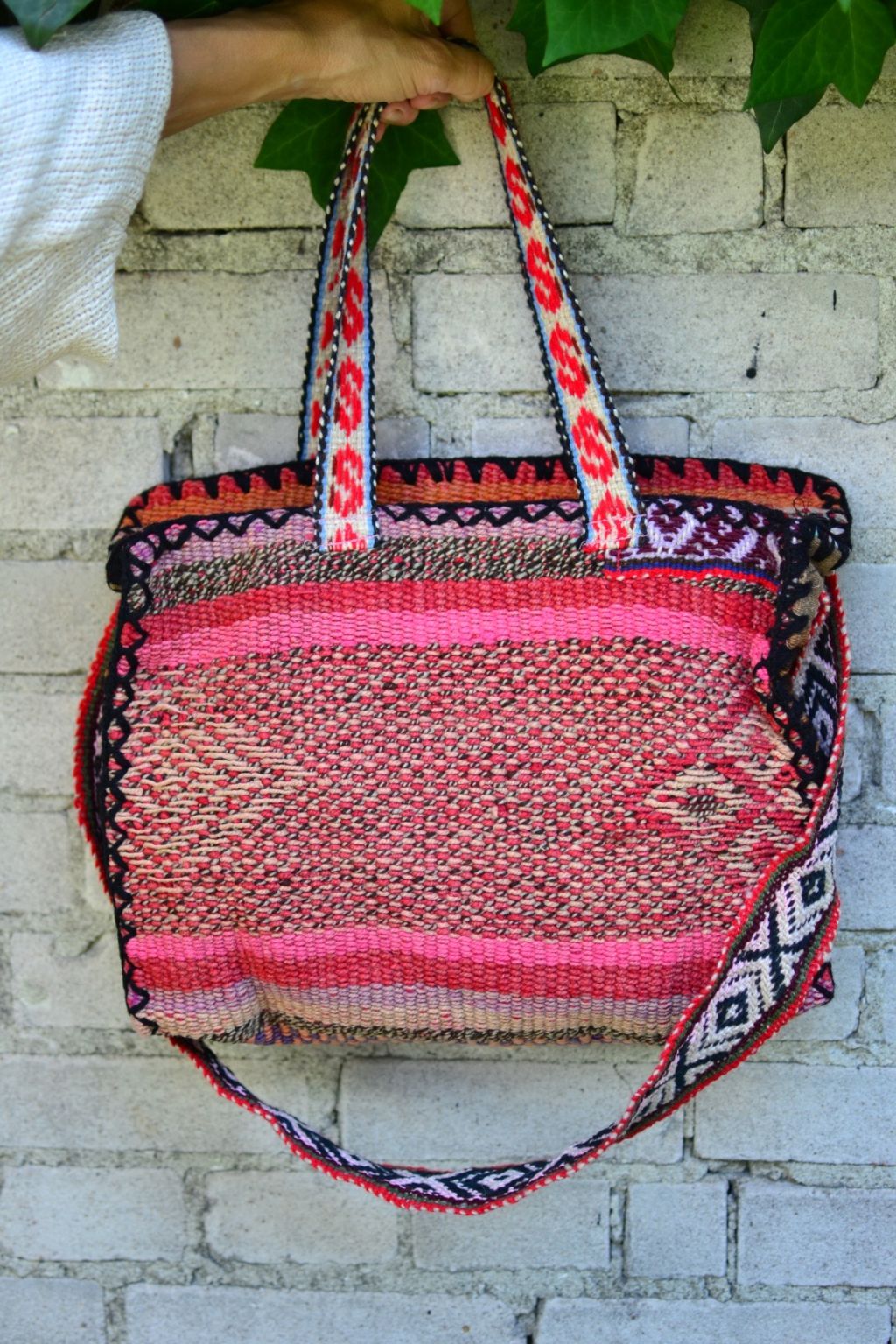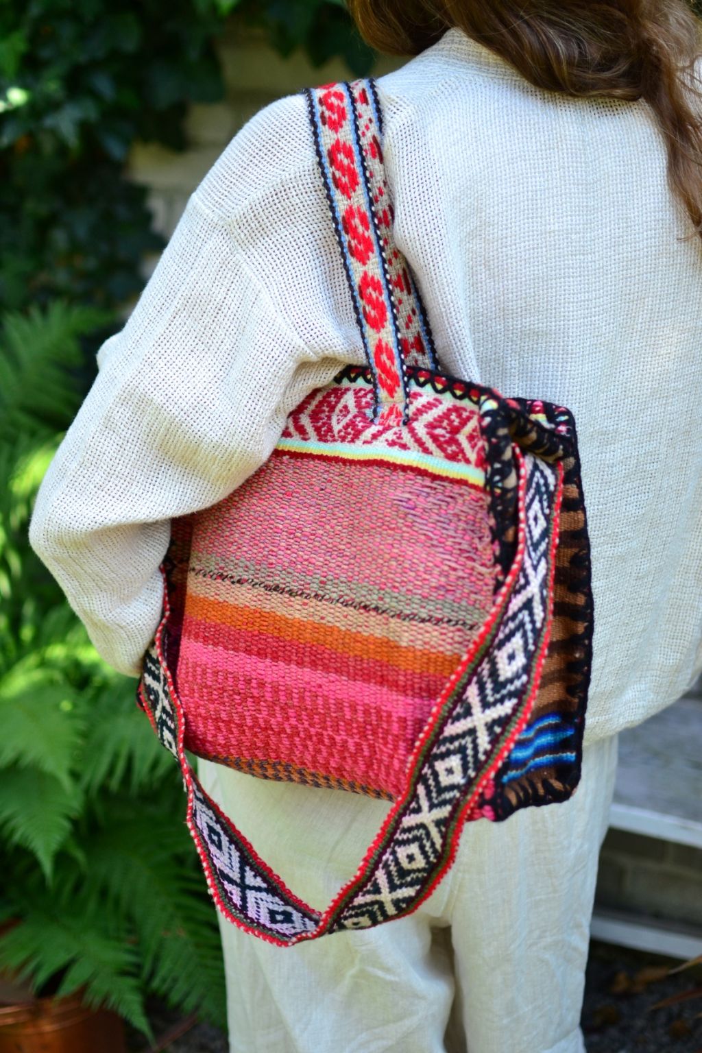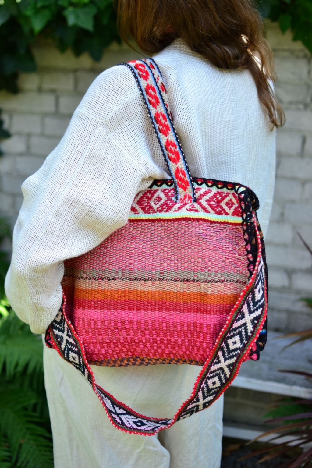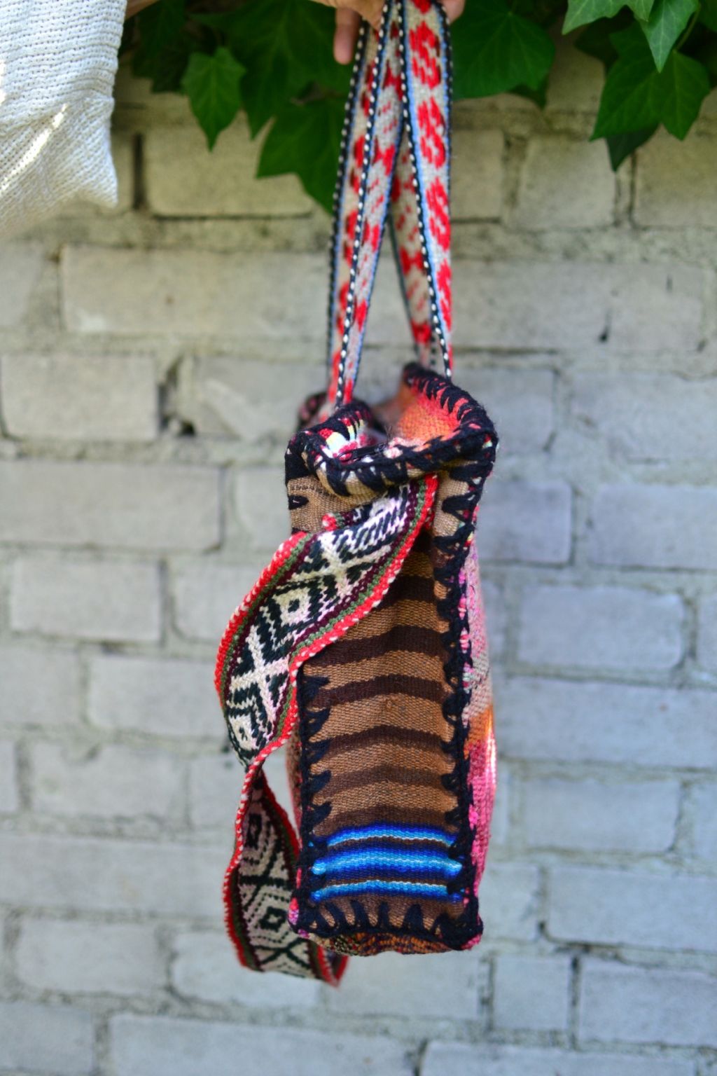 Duża dwustronna torba shopper uszyta w Peru z ręcznie tkanej i naturalnie barwionej wełny. W środku wykończona czarną podszewką. Zapisana na zamek. Posiada jedną komorę i małą kieszonkę na zamek. Torba jest bardzo pojemna. Posiada dwa uchwyty i dodatkowy długi pasek.