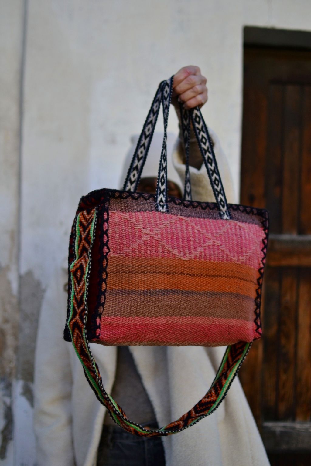 Duża torba shopper uszyta w Peru z ręcznie tkanej i naturalnie barwionej wełny. W środku wykończona czarną podszewką. Zapisana na zamek. Posiada jedną komorę i małą kieszonkę na zamek. Torba jest bardzo pojemna. Posiada dwa uchwyty i dodatkowy długi pasek.